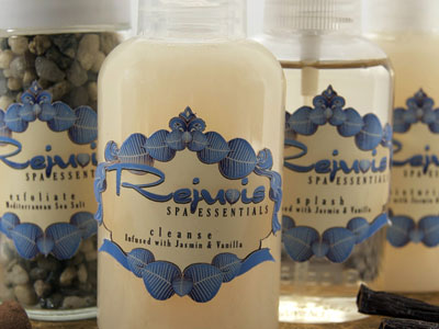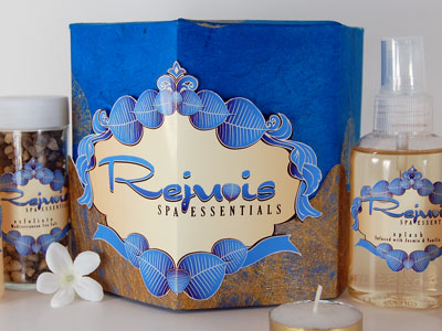 Package and product label design for Rejuvis Spa Essentials.